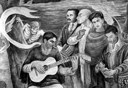 Este último conjunto ųquizá el más abigarrado por la cantidad de personajesų integra en los primeros planos a un cantador de corridos rodeado de José Vasconcelos, Carlos Pellicer, Frida Kahlo y su joven discípulo Arturo García Bustos, con un morral otomí que le tejió su abuela indígena.