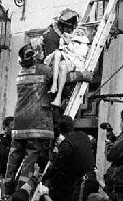 Bomberos rescatan a una anciana durante el incendio de una pipa frente al Cafe Tacuba n Foto: Rubén Pax