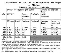 La razón del aumento de la pobreza reside en que, contrario a lo que Salinas sostiene, la distribución del ingreso durante su gobierno empeoró. En el cuadro se presentan los coeficientes de Gini6 según CEPAL, INEGI; Banco Mundial, BID y Fernando Cortés. Los de CEPAL son los citados por Salinas. Nótense que estos Ginis son los únicos que: 1. se presentan desagregados en rural y urbano sin proporcionar los cálculos nacionales. 2. en el periodo 1989-92-94 muestran un descenso. 3. entre los calculados sobre la base del ingreso per cápita de los hogares, tienen valores más bajos que los calculados en base a los ingresos totales de los hogares por el INEGI7.