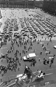 Un bombero sube al edificio de la ALDF en el Zócalo, como parte de un simulacro de eva-cuación en inmuebles públicos, mientras en la plancha de la Plaza de la Constitución un grupo de taxistas en plantón demanda la entrega de concesiones n Foto: José Antonio López