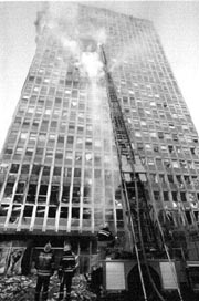 Bomberos yugoslavos combaten las llamas en un edificio de Nuevo Belgrado bombar- deado por aviones de la OTAN n Foto: Ap
