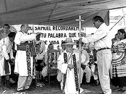 Samuel Ruiz García durante la entrega simbólica del gobierno diocesano de San Cristóbal de las Casas al obispo coadjutor Raúl Vera López n Foto: .Juan Carlos Calderón