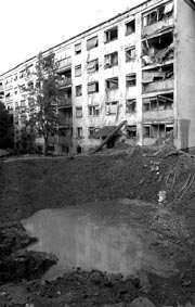 La fotografía muestra un enorme cráter que provocó una bomba que cayó frente a un conjunto residencial para trabajadores serbios