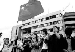 Ante las ruinas de la embajada en la capital yugoslava se manifestaron cientos de personas, entre ellas unos 200 residentes chinos en Yugoslavia, para protestar por la agresión e intercambiar muestras de solidaridad entre serbios y chinos.