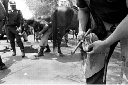 Efectivos de la Policía Montada de la SSP herran sus caballos frente a la Secretaría de Go-bernación n Foto: Alfredo Estrella