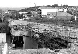 El puente sobre el río Juzna Morava, ubicado frente al poblado de Vladicin Han, aparece totalmente destruido por las incursiones de los aviones de la alianza noratlántica