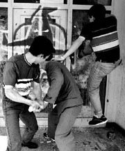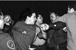Chinos que residen en Belgrado destrozan la puerta de la embajada de Estados Unidos, durante una protesta contra los bombardeos de la alianza noratlántica a Yugoslavia