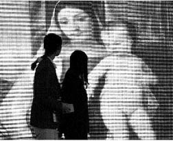 Escena captada la noche del miércoles durante una exposición computacional en Pekín, en la que una gran pantalla electrónica reproduce una imagen de María y Jesús, en ocasión de que el Partido Comunista determinó que no existe contradicción entre su ateísmo (la famosa frase: ''La religión es el opio de los pueblos") y la aprobación oficial de cinco prácticas religiosas en China: catolicismo, protestantismo, budismo, taoísmo e islamismo, consi-derados allá como supersticiones n Foto: Natalie Behring/ Reuters