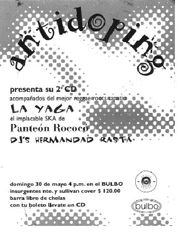 El grupo de reggae Antidoping presenta mañana su segunda producción discográfica en el Bulbo (Insurgentes Norte y Sullivan). Para tal acontecimiento los acompañará el mejor grupo de reggae de Guanatos, La Yaga, y el implacable ska de Panteón Rococó. Además los Dj's de la Hermandad Rasta. Habrá barra libre de chelas y con el boleto te llevas el CD de Antidoping. Desde las 16:00 horas. El cover: 120 pesos. (Jorge Caballero)