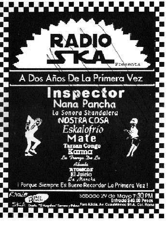 El Alicia (Cuauhtémoc 91, Roma) presenta este sábado, a partir de las 19:30 horas, su festival Radio Ska. En el nutrido cartel se encuentran Inspector, Nana Pancha, La Sonora Skandalera, Nostra Cosa, Eskalofrío, Mate, Tarzán Congo y seis bandas más. Esta tocada sería la segunda versión que se realiza en el Alicia; la primera fue hace un año, y la pretensión es hacerlo de forma anual. Así que no se lo pierda, porque las bandas prometen ponerlo a bailar, y si no desea rozarse con los kids bailadores de ska, puede ver el enorme slam dance que se hace en el Alicia. Eso sí, no respondemos si sale algo golpeado por la marea de gente.
