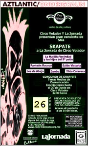 No será muy seguido y tampoco lo queremos hacer una costumbre, pero hoy nos agandallamos este espacio porque, cómo decirlo para que no se escuche mamón... La Jornada presenta su miscelánea/cartelera/página desmadre dedicada al ambiente subterráneo: Aztlántic Ondergraun, como si fuera quinceañera de pueblo, ante la sociedad rocanrolera, con un concierto que titulamos: Skápate, que se realizará el próximo 26 de junio a partir de las 14:00 horas, en el Circo Volador (calzada La Viga 146, afuera de la estación del Metro del mismo nombre), uno de los mejores espacios dedicados al apoyo de la cultura underground y en coordinación con la estación de radio, que permanentemente y exclusivamente programa rock en español: Orbita 105.7, el universo del rock. En este toquín actuarán las seis mejores bandas de ska del país; estarán, en estricto orden de importancia y sólo para ser muy precisos: La Maldita Vecindad y los Hijos del Quinto Patio, (dudas, opciones o molestias, favor de dirigirse con nosotros mismos), que interpretarán su amplio repertorio; Panteón Rococó, que cada vez tiene más adeptos y que promete poner a bailar a todos con su ritmia; Salón Victoria no se quedará atrás y también tocará cañón; Los de Abajo, con su sonido sabrosón no será la excepción, y Jambo y Xhix-Calavera serán los encargados de prender a la banda para que la tocada se ponga pocamadre.