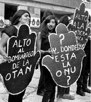 La Red de Mujeres por la Paz y en apoyo a Mujeres de Negro de Yugoslavia realizó ayer un plantón frente a la embajada de Italia en México, para exigir el cese inmediato de los bombardeos en los Balcanes y que se detenga la limpieza étnica que lleva a cabo el gobierno de Slobodan Milosevic n Foto: Duilio Rodríguez