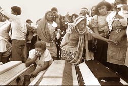 Pero los más son muertos anónimos. Como los que tiraban al mar los helicópteros durante la guerra sucia de los 70; y se reúnen para buscarse en la lista de desaparecidos que hizo el Comité de Familiares. O los siete costeños que murieron con los huaraches puestos en 1959. Haber muerto de pie enorgullece a todos los matados políticos, pero es un decir; en cambio estos siete costeños murieron literalmente parados en una mazmorra de cuatro por cinco metros, donde los olvidaron por seis días con otros 43 detenidos.