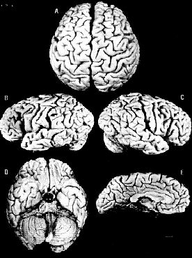En el único estudio conducido sobre la anatomía general del cerebro de Albert Einstein, hecho por investigadores de la Universidad de McMaster en Ontario, Canadá, se descubrió que la región parietal, la cual se relaciona con el razonamiento matemático, era 15 por ciento más ancha de lo normal en ambos lados, lo que hace distinto a dicho órgano de este genio. La imagen, tomada en 1955, muestra cinco vistas del cerebro de Einstein. Las partes mostradas son: A, superior; B, lateral izquierdo; C, lateral derecho; D, inferior, y E, una vista del hemisferio derecho n Foto: Ap