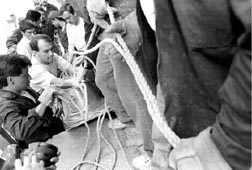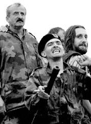 Reservistas del ejército de Yugoslavia, que habían capturado a un miembro del ELK (derecha), se manifiestan contra el gobierno