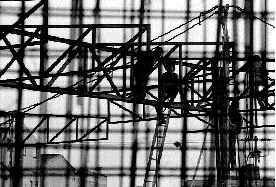 Trabajadores arman la estructura de un anuncio, en la delegación Venustiano Carranza * Foto: José Carlo González