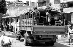 Un convoy militar realiza tareas de vigilancia en la cabecera municipal. Los vecinos aseguran que ha aumentado la presencia de la tropa en la zona n Foto: Karina Tejeda