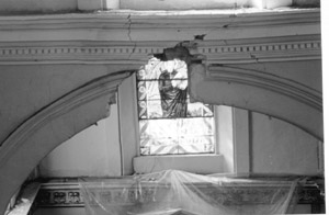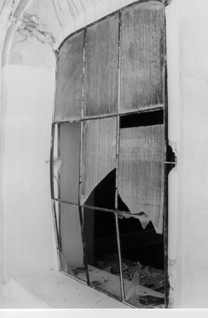 ![]() Ť Colapso del techo en su cara sur, evidenciado en el abonbamiento de la ventane metálica.