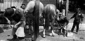 Policías del Agrupamiento a Caballo de la Secretaría de Seguridad Pública hierran a sus caballos * Foto: Francisco Olvera