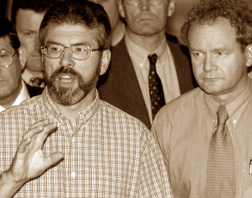El plan prevé la inclusión en el ejecutivo local de dos miembros del grupo católico Sinn Fein (cuyo líder, Gerry Adams aparece en la foto), brazo político del ERI, pero se advierte que si el desarme no ocurre, el grupo católico sería excluido de ese poder, y la asamblea y el resto de las instituciones del gobierno local quedarían suspendidas.