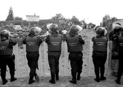 Granaderos montan guardia en el predio Framboyanes, en la colonia Fuentes del Pedregal, donde hubo un enfrentamiento con paracaidistas del lugar n Foto: Marco Peláez