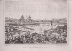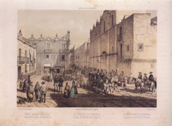 Se encaminaron hacia el poniente. Frente al largo portal de Mercaderes se veían alineados los coches de providencia, los carros de carga y los tranvías de mulas. En las esquinas de la plaza mayor y 16 de septiembre, donde se unían el Portal de los Mercaderes y el Portal de los Agustinos, el comercio se animaba. Manuel vio dos grandes rótulos de tiendas de las esquinas sur y norte. Ciudad de Londres y El Triunfo del Comercio. Manuel volvió la vista hacia el norte y vio al fondo, por un instante, siguiendo la línea de Empedradillo, la plaza y la iglesia de Santo Domingo y la Escuela de Medicina. Los amigos siguieron la marcha bajo los portales de los Agustinos y de la Fruta y luego por en medio de la calle. Llegaron a San Juan de Letrán y viraron a la derecha.