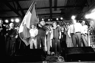 Carmen Lira, a quien flanquea ondeando la bandera de México el
