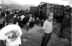 Cadetes de la policía chiapaneca protegen la llegada de evangélicos desplazados de Ikaluntic, quienes más tarde volvieron a ser expulsados Ť Foto: Tomás Bravo