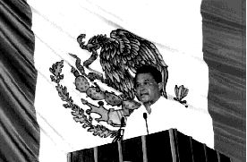 El gobernador Joaquín Hendricks Díaz, durante su discurso en el teatro Constituyentes del 74, para conmemorar los 25 años de Quintana Roo como estado libre y soberano