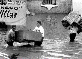La Jornada miércoles 13 de octubre de 1999 DESASTRE EN TIZAYUCA, HIDALGO Vecinos de la unidad habitacional San Antonio trasladan algunas de las pertenencias que lograron salvar de la inundación Foto: Carlos Ramos Mamahua |