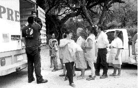 Empleados de esta casa editorial reparten despensas a vecinos de Metztitlán, Hidalgo, afectados por las lluvias Ť Foto: Armando Loaiza NUEVO LAREDO