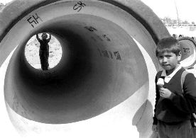 Niños habitantes de la colonia La Palma, en Tultepec, encuentran entre tubos para drenaje una forma de divertirse Ť Foto: Alfredo Estrella DESASTRE