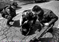 Policías de la Secretaría de Seguridad Pública transportan una granada activada que fue encontrada en un camión de basura Ť Foto: Carlos Ramos Mamahua |
