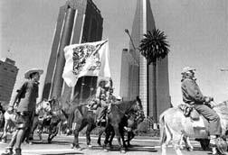 Los jinetes barzonistas desfilaron ayer por Paseo de la Reforma hasta llegar a la Plaza de la Constitución, donde pernoctaron. Este día realizarán manifestaciones frente al Banco de México, las oficinas del Gobierno del Distrito Federal y del Senado de la República * Foto: Frida Hartz