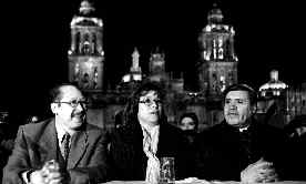 Rosario Robles, a quien acompañan Leonel Godoy y el cardenal Norberto Rivera, inauguró ayer la iluminación artística de la Catedral Metropolitana Ť Foto: José Carlo González