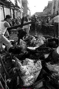 Comerciantes rescatan mercancía después del incendio ocurrido en una bodega ubicada en las calles de Roldán y Corregidora Ť Foto: Rosaura Pozos