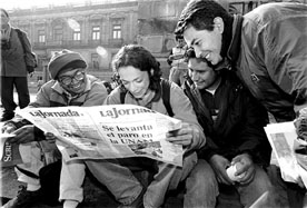 General de Huelga leen frente a la Plaza Tolsá la edición de La