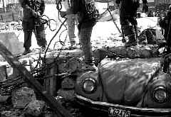 El conductor del taxi ecológico, placas L62475, Juan Hernández, salvó la vida "de puro milagro" al caerle encima una barda de tres metros de alto por tres de largo cuando circulaba frente a una obra en demolición ubicada en la esquina de bulevar Puerto Aéreo y calle Norte, colonia Moctezuma segunda sección. Personal de Bomberos rescató al taxista del interior del vehículo, donde había quedado atrapado, y aunque sólo presentaba una lesión en la cabeza, fue trasladado al Hospital de La Villa por una ambulancia del ERUM, donde permanece en observación Ť Foto: Carlos Cisneros