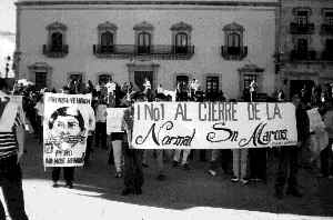 Estudiantes de la Escuela Normal Rural Matías Ramos, ubicada en el municipio Loreto, mantienen un plantón frente al Palacio de Gobierno, en la capital del estado, para exigir la reapertura del plantel Ť Foto: Alfredo Valadez