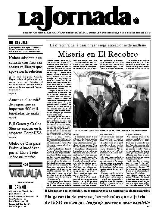 La Jornada, Coordinación de Sistemas Francisco Petrarca 118, Col. Chapultepec Morales, delegación Miguel Hidalgo México D.F. C.P. 11570 Teléfono (525) 262-43-00, FAX (525) 262-43-56 y 262-43-54