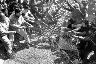 Encabezados por porros y un profesor, alumnos de Derecho derribaron una barricada que resguardaban paristas sobre avenida Universidad e irrumpieron en ese plantel; en el enfrentamiento hubo varios estudiantes heridos. También ocurrieron zacapelas en la Preparatoria 6 y el CCH Naucalpan. Las autoridades de la UNAM condicionaron el reinicio de las negociaciones a que éstas se realicen en la explanada de la torre de rectoría y se permita el libre acceso a las asambleas de escuelas Ť Foto: Daniel Aguilar/Reuters