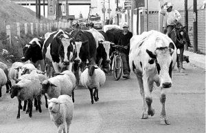Dos modernos pastores, uno en bicicleta y el otro a caballo, conducen a su rebaño por las calles de Ecatepec, uno de los municipios conurbados con la capital de la República y con mayor densidad de población Ť Foto: José Carlo González