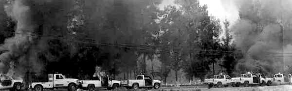 Indignados por la ocupación, vecinos del municipio Francisco I. Madero prendieron fuego a los alrededores de la localidad, para evitar que los granaderos escaparan. Los agentes que no lograron huir fueron amagados por la población y conducidos a la plaza central Ť Fotos: Carlos Camacho