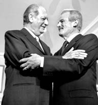 El presidente electo chileno, Ricardo Lagos, se reunió con el candidato priísta, Francisco Labastida Ochoa, en Santiago, donde el político sinaloense también conversó con los uruguayos Jorge Batlle y Julio María Sanguinetti, el argentino Fernando de la Rúa, la familia Allende y periodistas de El Mercurio. Hoy toma posesión el nuevo mandatario chileno Ť Foto: Ap