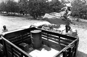 Durante los trabajos para recolectar costales en una bodega de frijol ubicada en Estación Nanchi Ť Foto: Tomás Bravo