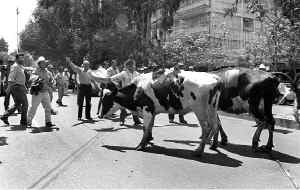 Integrantes de la Unión Nacional de Productores de Leche tiraron unos dos mil litros del lácteo y soltaron dos vacas enfermas frente a la Secofi para exigir que cese la importación de productos Ť Foto: Rosaura Pozos
