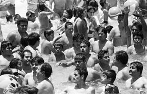 Cientos de personas, imposibilitadas de viajar a otros estados en este periodo vacacional, comparten albercas de 35 por 35 metros en balnearios de la ciudad de México, donde la distancia entre cada bañista es apenas de 30 centímetros Ť Foto: Arturo Guerra