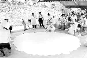 Aspecto de la elaboración de la enorme tortilla, conocida como mega tlayuda Ť Foto: Ezequiel Leyva
