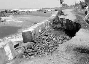 Protección Civil de Chiapas declaró prealerta preventiva en Puerto Madero luego de que fuertes marejadas arrasaron parte de la carretera y destruyeron cinco palapas de la zona restaurantera, la madrugada de este martes Ť Foto: Rodolfo Villalba Sánchez