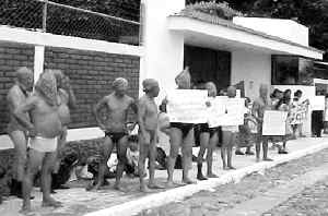 Integrantes de la Coalición Obrera, Campesina, Estudiantil del Soconusco (COCES) se desnudaron frente a la Casa de Gobierno de Chiapas para protestar por el incumplimiento de generar e impulsar proyectos productivos Ť Foto: Agrasur